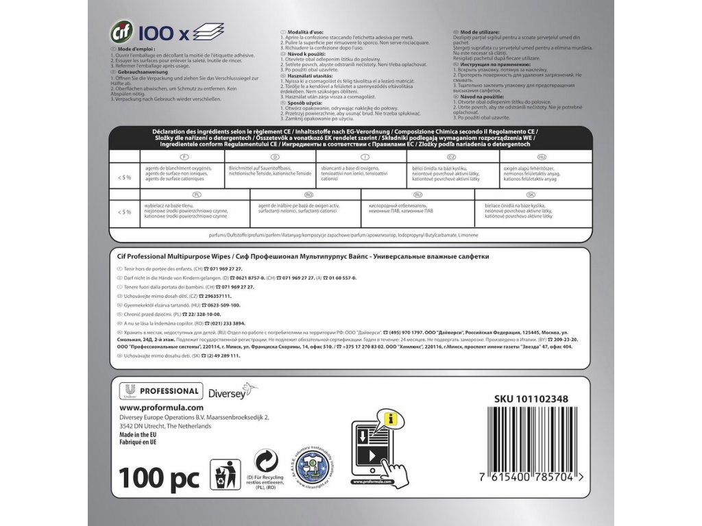 Cif Multipurpose Wipes. Univerzálne čistiace vlhčené utierky. Na rýchle a účinné čistenie väčšiny povrchov, odstraňujú viditeľné aj neviditeľné nečistoty. Pohodlné a rýchle riešenie, ktoré vám pomôže udržať vysoký štandard čistenia, bez toho aby vás to stálo príliš veľa času z vášho nabitého programu. Čistiace utierky sú vhodné na všetky umývateľné povrchy ako sú napríklad drezy, sporáky, kúpeľňové povrchy, toalety, odpadkové koše, stoly a stoličky. Utierky majú špeciálnu textúru, ktorá zmäkčí, oddelí a nadvihne nečistoty a zanechá príjemnú sviežu vôňu.