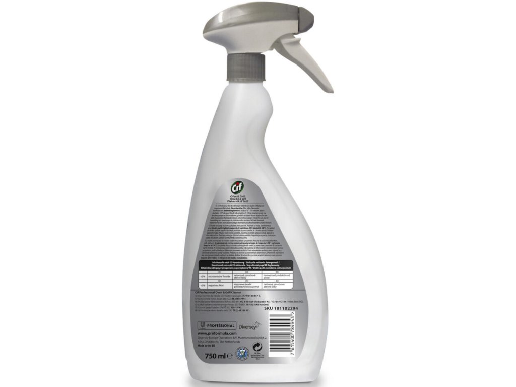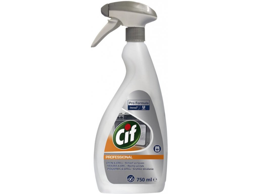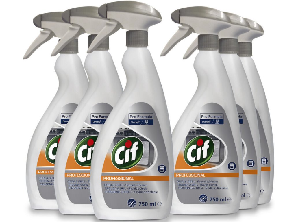 Cif Pro Oven & Grill Cleaner. Veľmi účinný čistiaci prostriedok, ktorý nájde uplatnenie na odstránenie odolnej mastnoty a pripálených zvyškov potravín v rúre, grile či konvektomate. Prostriedok nepoužívajte na povrchy, ktoré nie sú odolné voči alkáliám, lakované povrchy, hliník a samočistiace panely. Prostriedok aplikujte na povrch pri teplote maximálne 80°C. V prípade, že sa rúry nečistia pravidelne, je potrebné aplikovať viackrát, aby došlo k odstráneniu nečistôt. Použitie prostriedku je jednoduché a rýchle. Zmes alkalických a povrchovo aktívnych látok rozpúšťa usadeniny a zaisťuje perfektné výsledky čistenia.