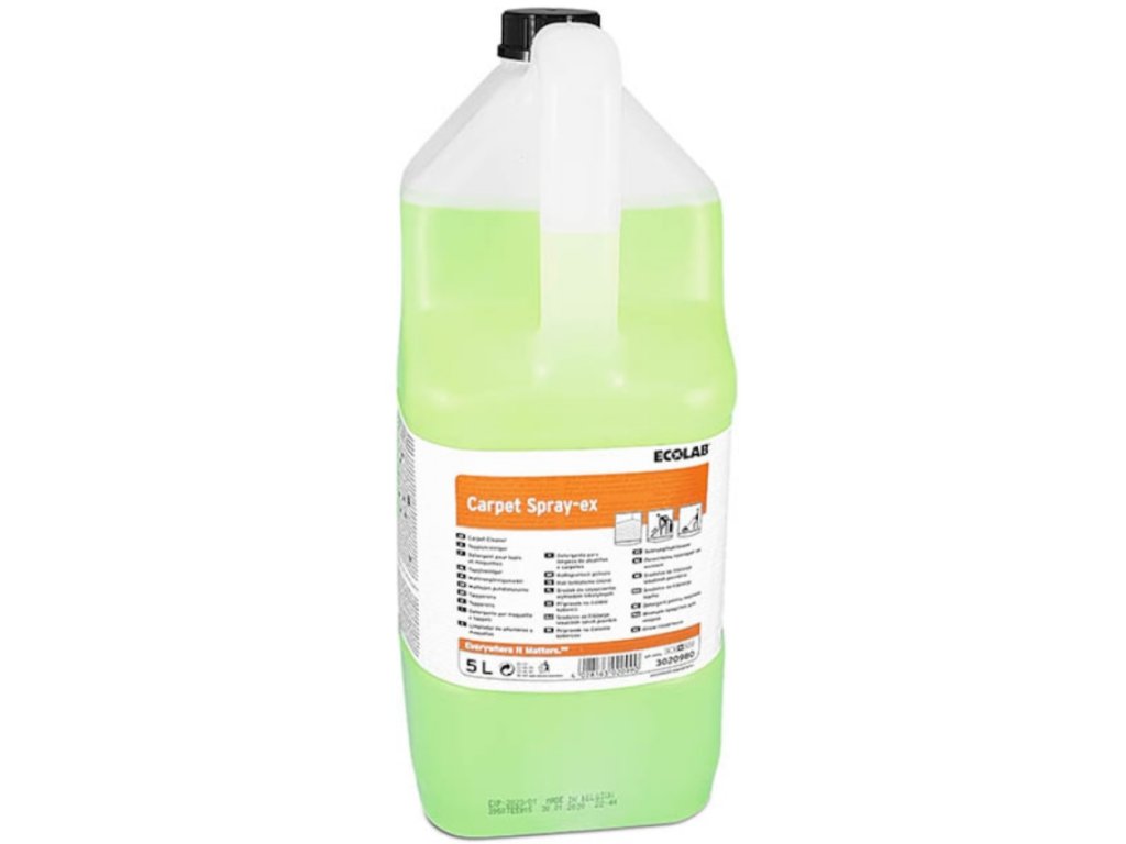 ECOLAB Carpet® spray-ex. Profesionálny čistiaci prostriedok na čistenie kobercov a čalúnenia extrakčnou metódou pre dôkladné a pritom šetrné čistenie kobercov a čalúnenia v interiéroch budov aj áut, apod.. Prostriedok sa používa na extrakčné čistenie kobercov a čalúnenia. Je nepenivý a má vysokú čistiacu schopnosť aj voči oleju a mastnote. Prostriedok svojím zložením účinne zabraňuje opätovnému znečisteniu koberca.