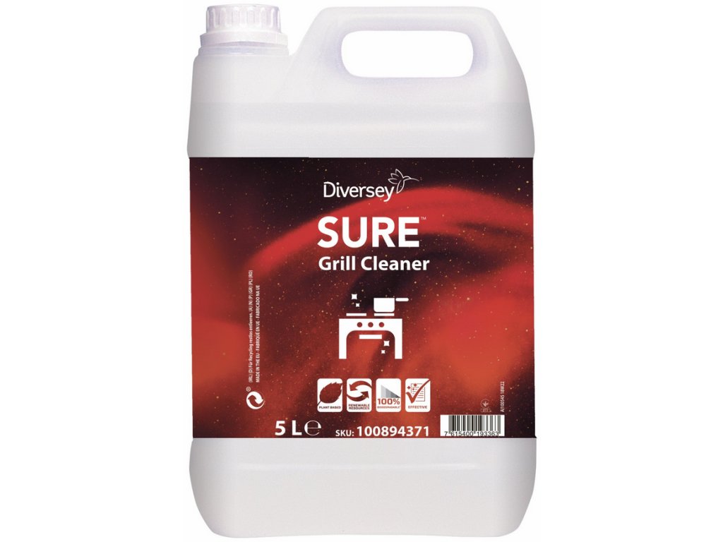 SURE Grill Cleaner. Ekologický čistiaci prostriedok do kuchyne, na rúry, grily a konvektomaty. Čistiaci prostriedok na denné čistenie silne znečistených plôch rúr na pečenie, grilov a konvektomatov. Prostriedok je vhodný na každodenné čistenie rúr, grilov, konvektomatov, zapekacích platní alebo filtrov. Špeciálne vyvinutý na denné čistenie. Vynikajúca priľnavosť na zvislých plochách. Ľahko sa oplachuje.