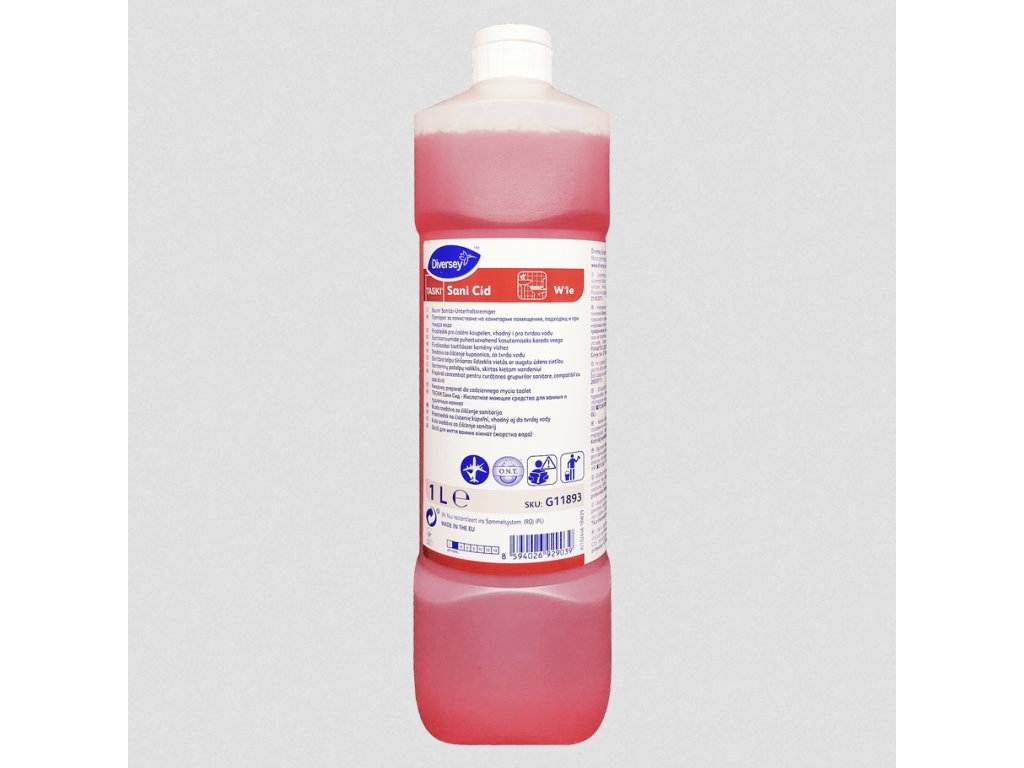 TASKI Sani Cid W1e. Prostriedok na čistenie kúpeľní na báze kyseliny citrónovej. Vhodný do oblastí s tvrdou vodou. Špeciálne zloženie prostriedku zaisťuje vynikajúci čistiaci výkon a zabraňuje usadzovaniu vodného kameňa, zvlášť v oblastiach s tvrdou vodou. Prostriedok je určený na denné čistenie povrchov, odolných voči kyselinám v kúpeľniach a sanitárnej oblasti. Šetrné zloženie prostriedku pre maximálnu bezpečnosť pri aplikácii. Nezanecháva žiadne šmuhy. Príjemne vonia.